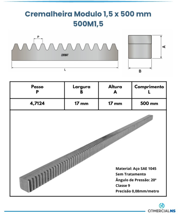 Cremalheira Reta Modulo 1,5 - 17x17 Comprimento 500 mm