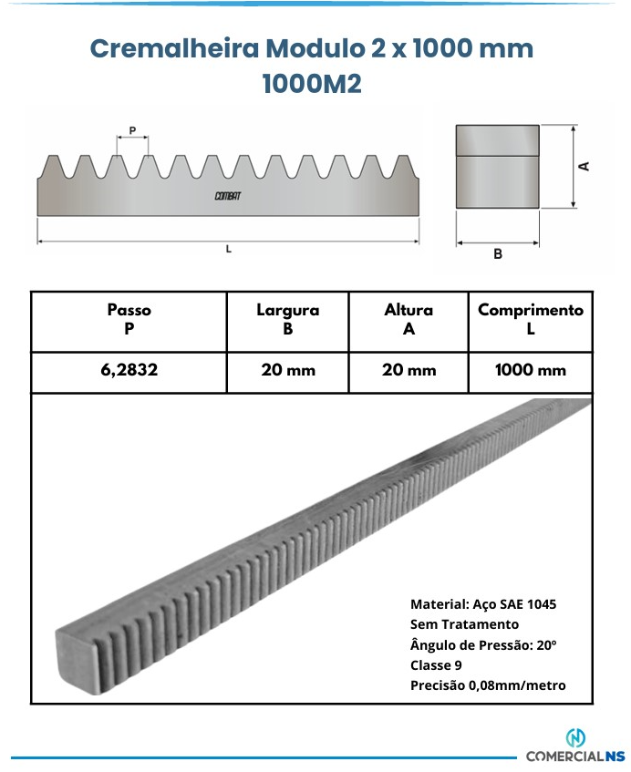 Cremalheira Reta Modulo 2 - 20x20 Comprimento 1000 mm