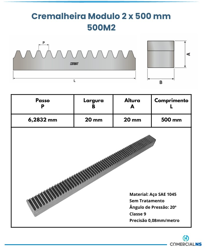 Cremalheira Reta Modulo 2 - 20x20 Comprimento 500 mm