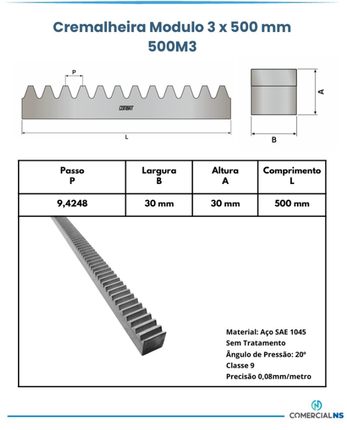 Cremalheira Reta Modulo 3 - 30x30 Comprimento 500 mm
